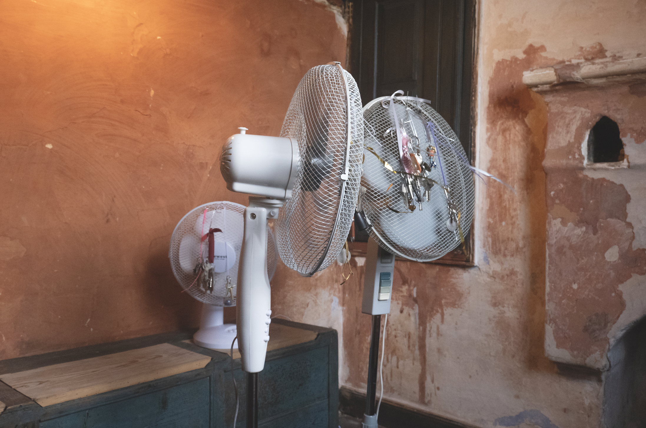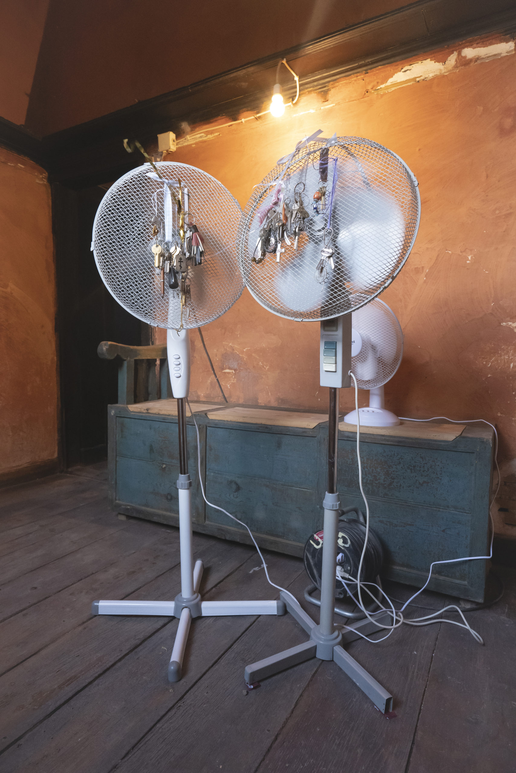 The fans can be acquired from a local or second hand market economy, and /or borrowed or loaned for the time of the installation. The fans can be of any color, size, table, wall, or pedestal, in the only condition that they are oscillating. House keys belonging to a network of family, friends, neighbours and strangers, are duplicated in the closest key shop. Each iteration of the piece is composed by new set of keys which relate to the site in which the piece is shown. An informal agreement between the key owners and the artist is made, stating that the copies acquired, are going to be used solely for exhibition purposes and that they are added in overgrowing archive of key duplicates.
